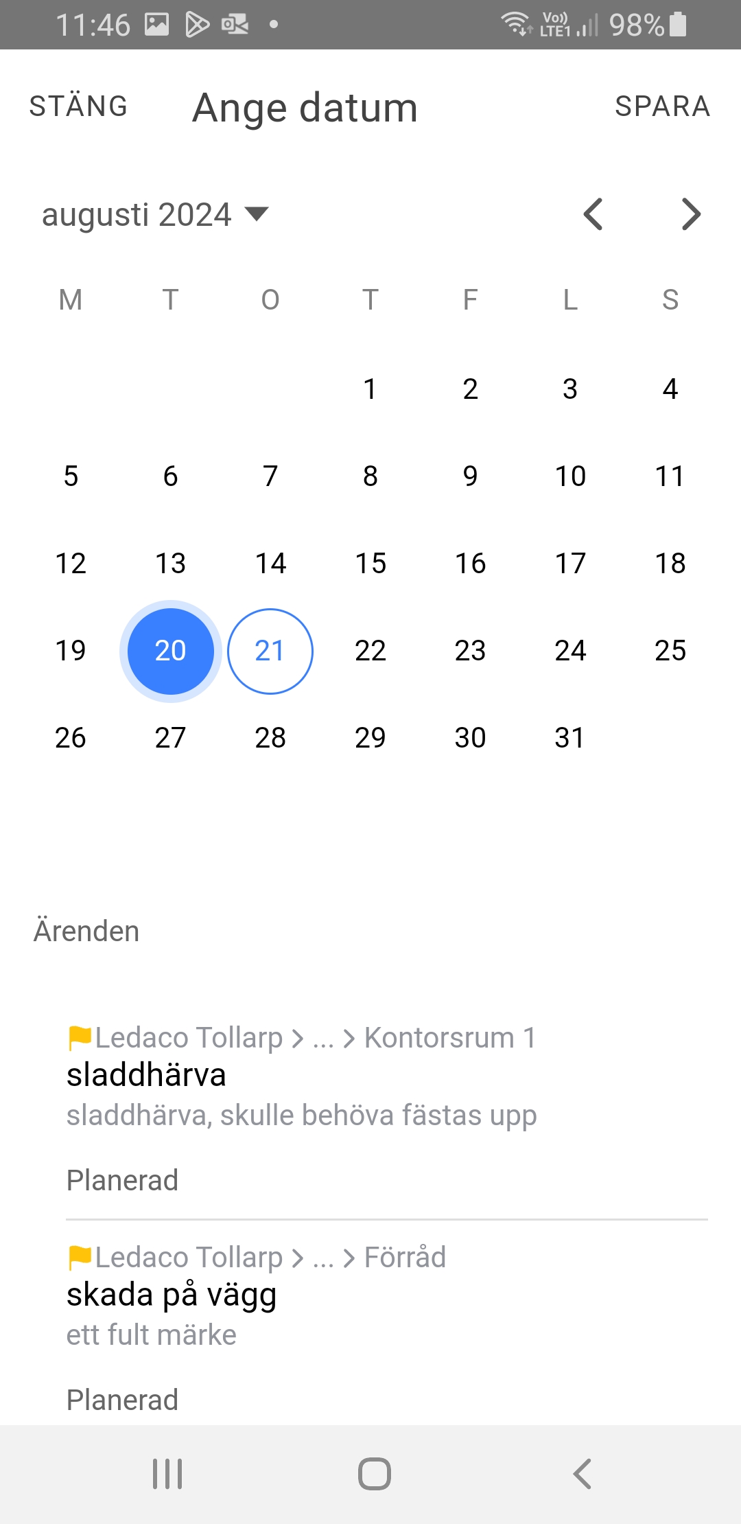 När du går till ett ärende och klickar på knappen "Ange datum" öppnas en dialogruta där du kan välja ett specifikt datum. Efter att du har valt datumet kan du spara dina ändringar, vilket uppdaterar ärendet med den nya informationen.