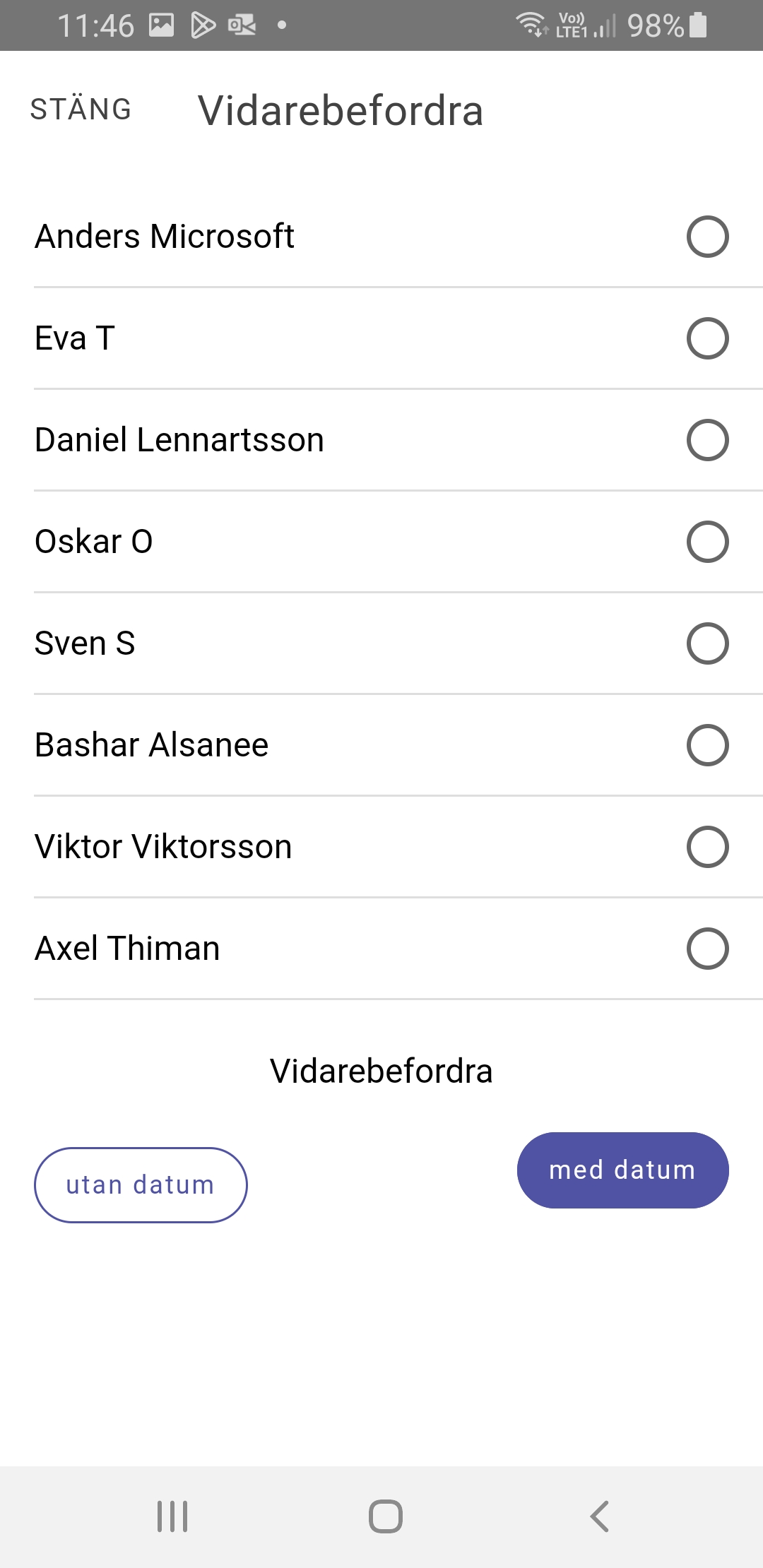 När du går till ett ärende och klickar på knappen "Vidarebefordra" öppnas en dialogruta där du kan välja att skicka vidare ärendet till en annan utförare, med eller utan datum.