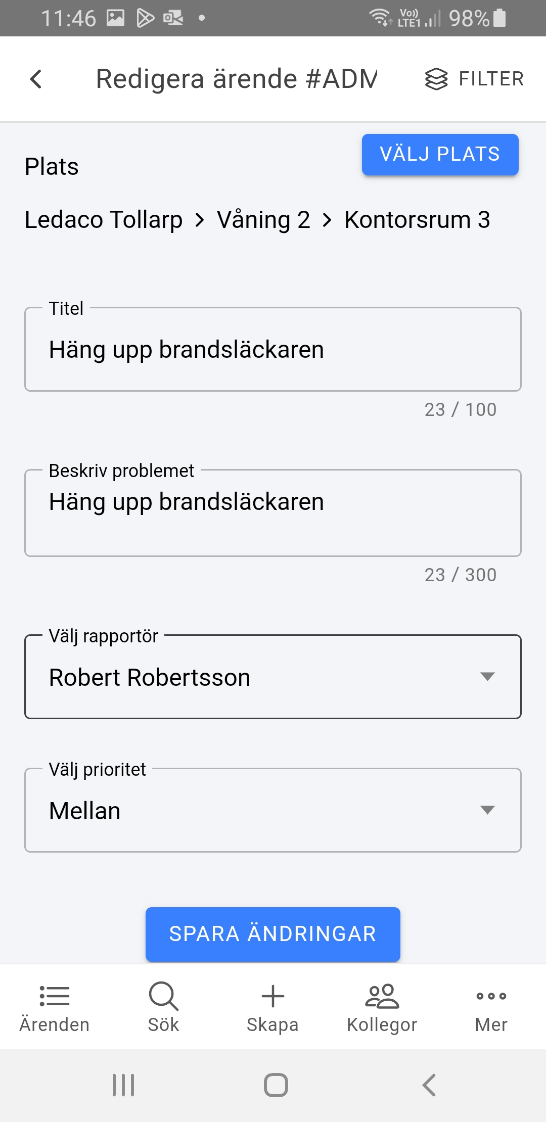 När du går till ett ärende kan du klicka på "Redigera"-knappen uppe i högra hörnet. Detta ger dig möjlighet att ändra ärendets uppgifter, såsom beskrivning, prioritet eller andra detaljer, för att säkerställa att informationen är uppdaterad och korrekt.
