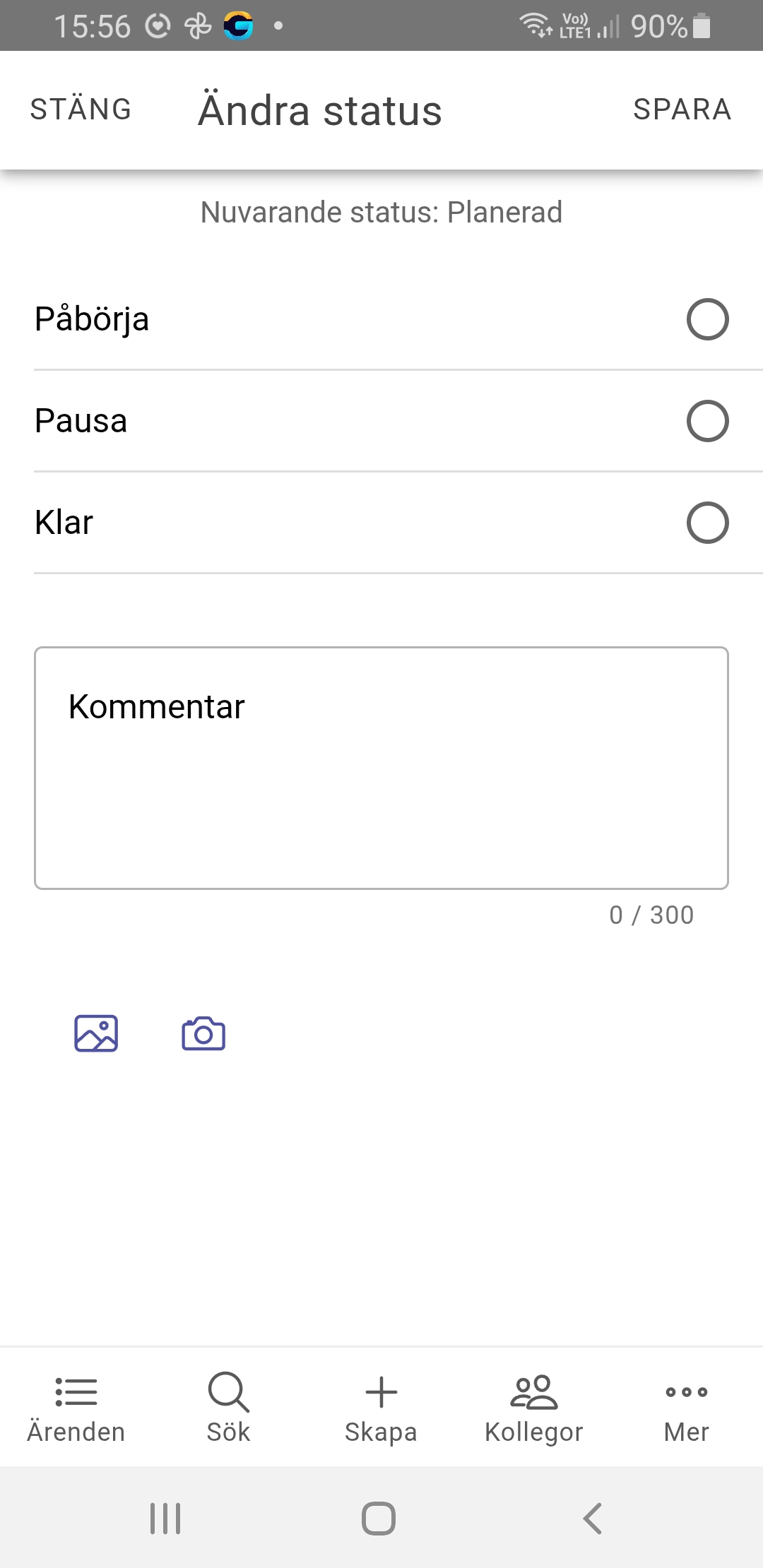 Bifoga/Ta bild vid statusändringDu kan nu bifoga en bild eller ta en ny direkt i appen när du uppdaterar status på ett ärende.