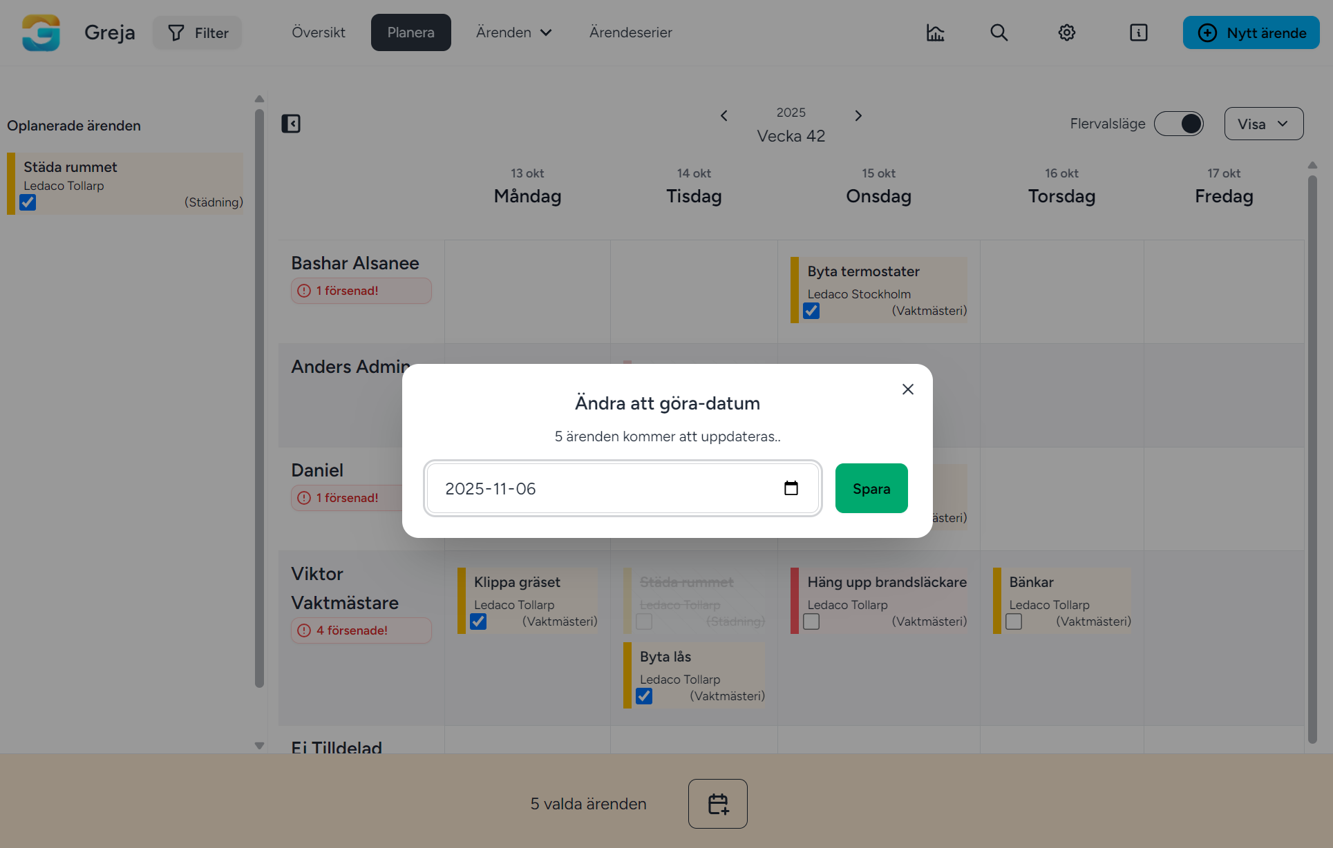 Flytta flera ärenden samtidigtSom admin i planeringsvyn kan du nu markera flera ärenden och flytta dem till ett specifikt datum i ett enda steg.