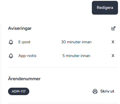 PåminnelserMed vår nya påminnelsefunktion kan du enkelt hålla koll på dina viktiga ärenden. För ärenden med angiven tid får du möjlighet att välja notiser både i appen och via e-post. Du kan själv ställa in när du vill bli påmind, från 5 till 60 minuter innan ärendet ska genomföras. Funktionen hjälper dig att vara förberedd och säkerställa att du inte missar något viktigt.