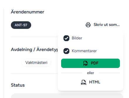 PDF-utskriftDet är nu möjligt att enkelt skriva ut ett ärende som en PDF-fil, så att du kan spara eller dela informationen på ett smidigt sätt.
