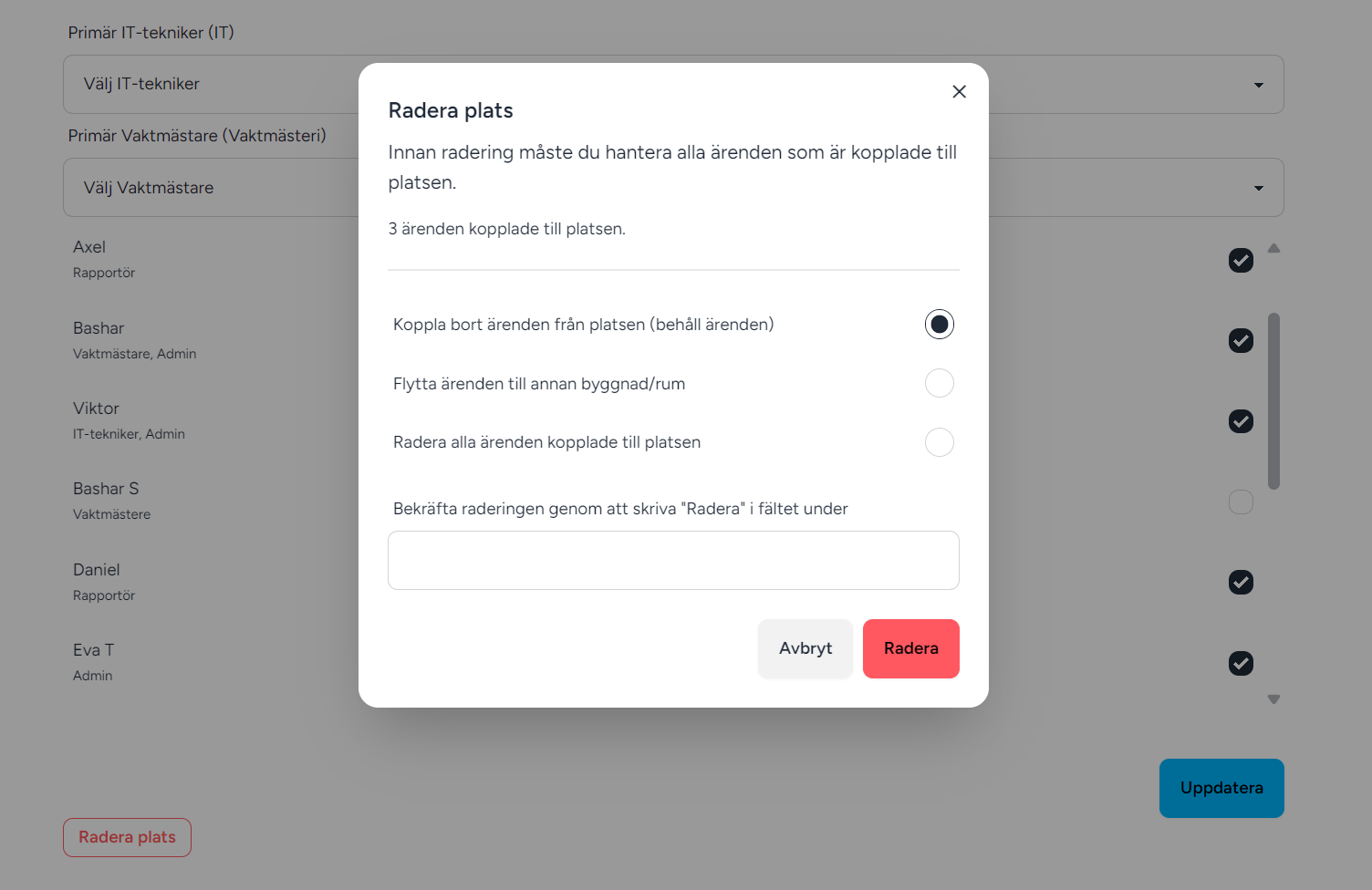 Ta bort platser som Super AdminSuperadmins kan nu radera platser direkt, vilket förenklar hantering av gamla eller felaktiga platser.