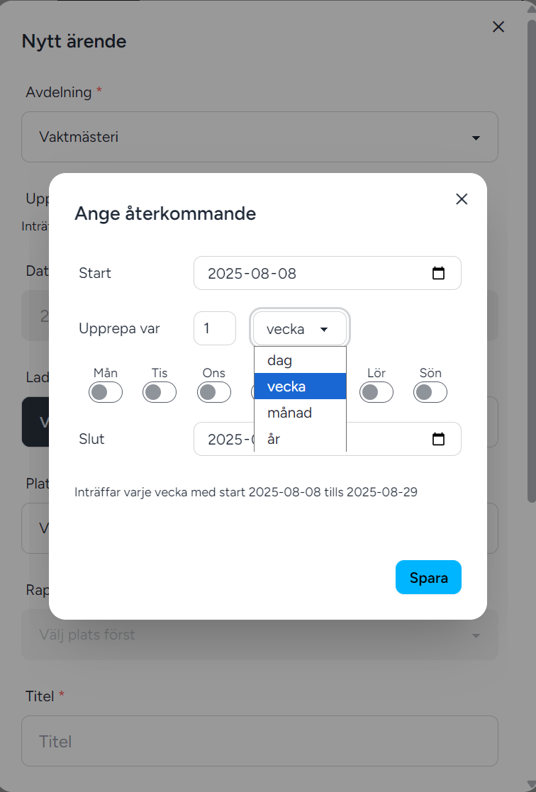 Återkommande ärendenÅterkommande ärenden är uppgifter som behöver utföras regelbundet över tid. För att hantera dessa kan du sätta ett start- och slutdatum, välja vilka veckodagar uppgiften ska utföras på samt ange hur ofta den ska återkomma med hjälp av ett intervall. Detta gör det enkelt att automatisera planeringen och hålla koll på uppgifter som kräver regelbunden uppföljning.